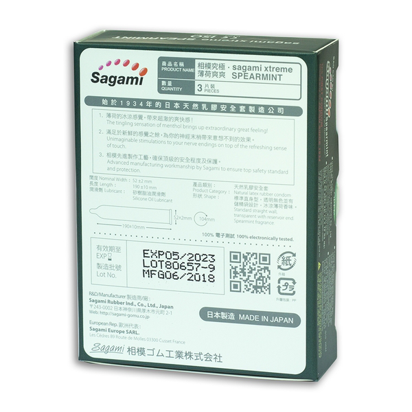 Bao cao su Sagami Xtreme Spearmint là bao cao su cao cấp giá rẻ của hãng bao cao su nổi tiếng Sagami theo yêu cầu của Nhật Bản hướng dẫn . Thiết kế bao siêu mỏng giúp cả hai dễ dàng tận hưởng trung tâm mọi cảm xúc khách hàng . Sản phẩm chứa thêm chất bôi trơn hương bạc hà tạo cảm giác mới lạ xuất xứ , giúp dễ dàng hơn cho việc yêu.